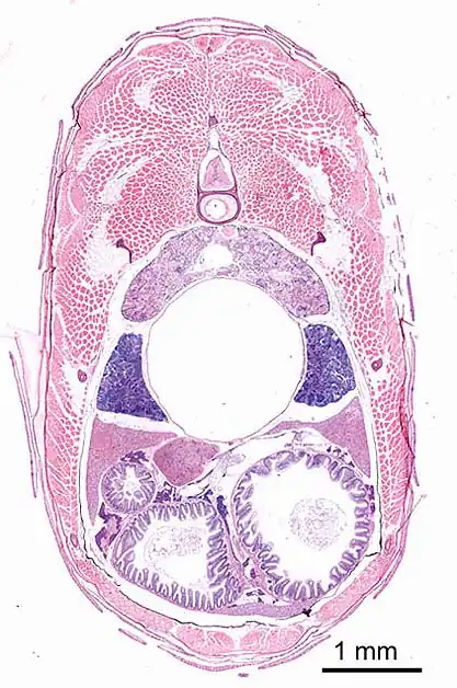 testis location, general structureThe testis [T] is a paired organ, located bilaterally between the abdominal wall [AW] and the swim bladder [SB]. At the level of this section, the testis is further bounded by the liver [L] and mesenchymal tissue [mt] (mainly adipose tissue); dorsally it is adjacent to the kidney and ventrally to the intestines (not visible on this level).
