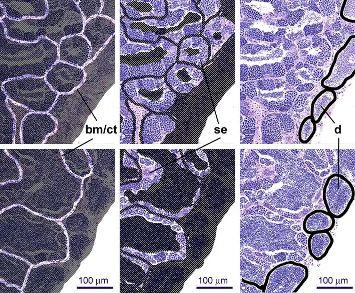 Each tubule is bounded by a basement membrane and a connective tissue sheet [bm/ct] (see Details below). Most tubules are covered with seminiferous epithelium [se], the structure of which is shown on the section below.