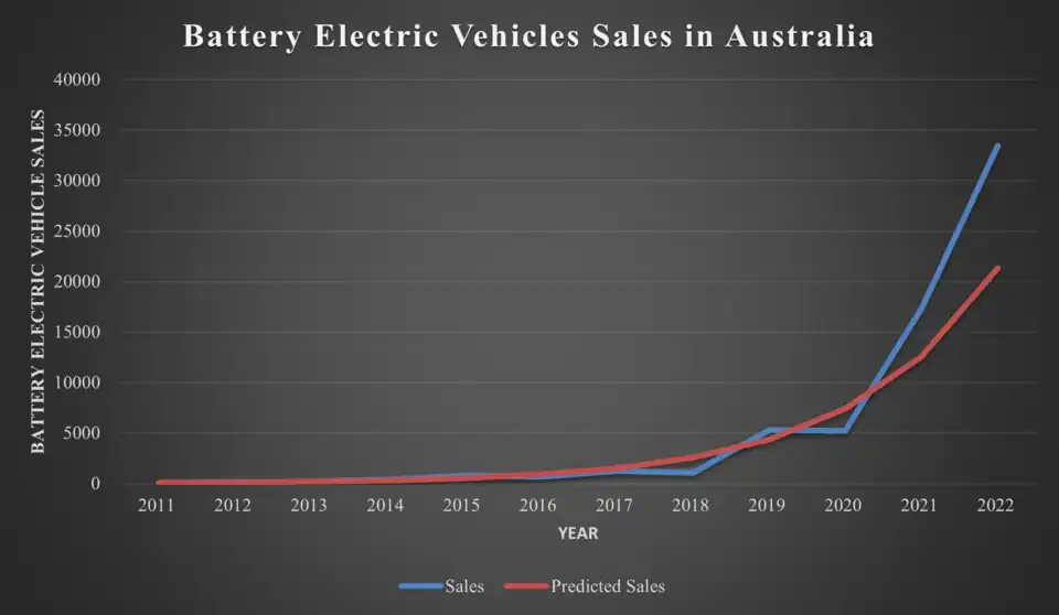 The data of battery electric vehicle sales in Australia is taken from State of Electric Vehicles 2023. In the year 2011, battery electric vehicle sale was just 49 numbers which slowly grew to 5292 in 2019. In 2021 sales was 17,293 and almost doubled in 2023 at 33,416.