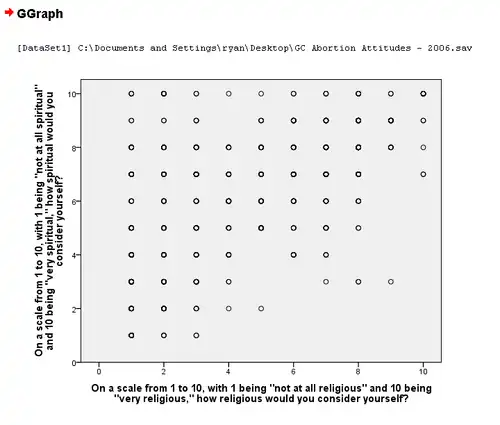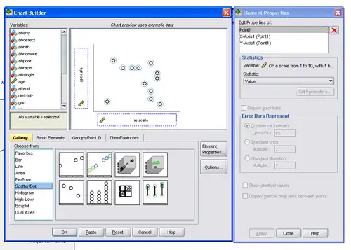 In the Chart Builder window, toward the middle of the screen make sure you've selected the "Gallery" tab, then select "Scatter/Dot" from the list of options. To the right of the options you'll see 8 boxes. If you hover over those, they will identify the type of scatterplot they will generate. Choose the one at the upper left of the choices, which is called "Simple Scatter." To choose it, you'll need to drag it up to the box above that says "Chart preview uses example data." You'll then be presented with two axes - a Y axis and an X axis. In our example, since we are using religiosity to predict spirituality, we drag relscale to the X axis and sprscale to the Y axis. We then select "OK" and get the following in our Output Window: