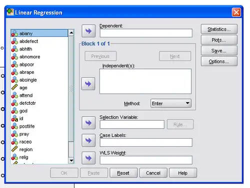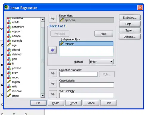 On the left is the list of variables. Find your dependent variable. In our example it is "sprscale." We move that over to the "Dependent" box with the arrow. Then find your independent variable. In our example it is "relscale." We move that over to the "Independent(s):" box: