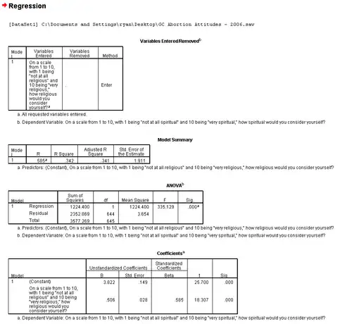The fourth table provides the regression statistics of most interest to our present efforts. The first column, "B", in the second row (not the first row labeled "(Constant)") provides the slope coefficient for the independent variable. What this means is that, for every 1 unit change in our independent variable, there is an XX unit change in the dependent variable. In our example, every 1 point increase in the 10 point religiosity scale results in a .506 point increase in the spirituality scale. This tells us that the relationship between the two variables we noticed in the scatterplot was accurate - the relationship is positive.