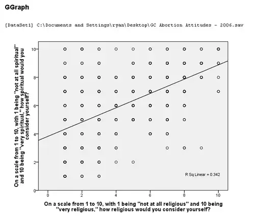 To illustrate how to do regression analysis in SPSS, we will use two interval variables from the sample data set. These same variables were used in some of the other chapters. Genetic counselors were asked to rate how religious and spiritual they consider themselves on a 10 point scale - higher values indicate more religious or more spiritual. In the analysis below, we are going to see how well religiosity predicts spirituality.