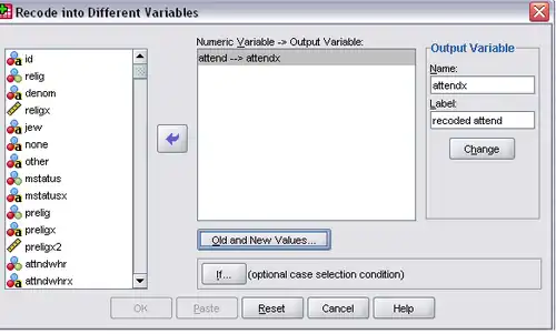 Click on “Recode into Different Variables”, as choosing the “Recode into Same Variable” would destroy the values of the existing variable. (The only time you'd use that is when fixing fouled labels.)
