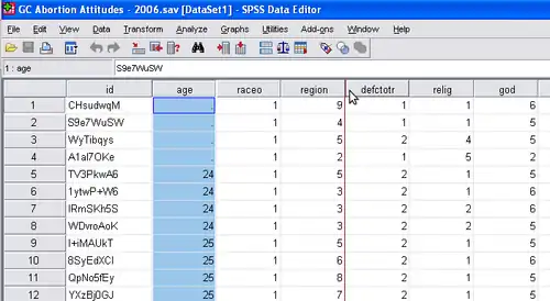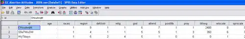 The Data View tab shows the raw data in your data set. The rows represent individual cases. If your level of analysis is people, then each case represents one person. Here are three: