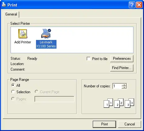 The print dialog box allows the user to select how output should be printed. Options and properties accessible to the user includes the amount of copies to make, print quality, the range of pages to print, ect. It also allows the user to choose another printer, as well as configure different settings regarding the current printer.