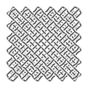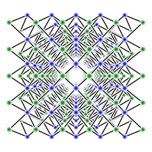 Each line represents a bond between two ions in a crystal of NaCl (sodium chloride = ordinary salt). Blue and green distinguish the two kinds of ions. It is a centered cubic crystal. Each Na+ ion is surrounded by 8 close neighbors Cl-. Likewise, each Cl- ion is surrounded by 8 close neighbors Na+. Two nearby ions always have opposite charges, because opposite charges attract each other while charges of the same sign repel each other.