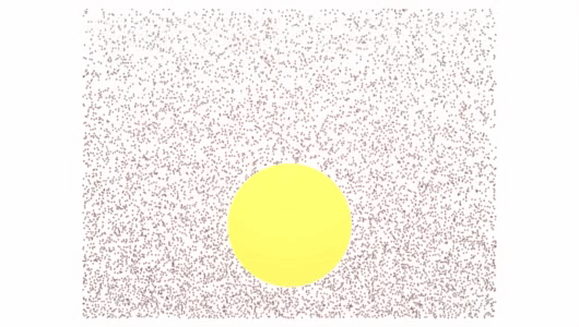 Hard disks subject to gravity bounce on each other. The large yellow disk experiences greater pressure at its base than at its top. This is why it is carried by the fluid like a hot air balloon.