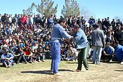 Gushtigiri is the national sport of Tajikistan. In Tajiki wrestling, the pahlavons (wrestlers) should wear the national coat and short pants and fasten a light belt around their waists. A pahlavon (wrestler) may grab and hold his opponentʼs belt, sleeve or collar of jacket or coat. Clench below the waist is not allowed. However, the sprints through legs are allowed. The winner is the one, who throws an opponent back down first.