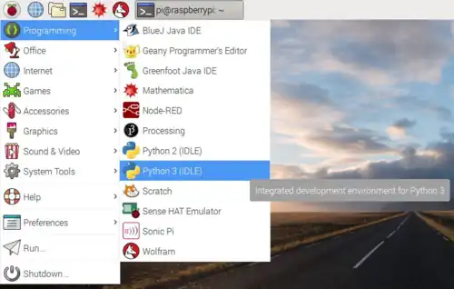 Python 3 and IDLE are pre-installed on Raspberry Pi OS. IDLE can be opened from the Programming menu.