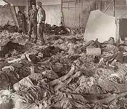 Upon arrival in these camps, all valuables were taken from the prisoners, and the women had to have their hair cut off[5]. According to a Nazi document, the hair was to be used for the manufacture of stockings[6]. Prisoners were divided into two groups: those too weak for work were immediately executed in gas chambers (which were sometimes disguised as showers) and their bodies burned, while others were first used for slave labor in factories or industrial enterprises located in the camp or nearby. Shoes, stockings, and anything else of value was recycled for use in products to support the war effort, regardless of whether or not a prisoner was sent to death. Some prisoners were forced to work in the collection and disposal of corpses, and to extract gold teeth from the dead.