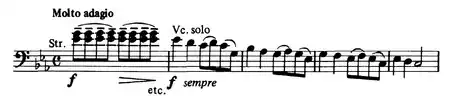 The piece is in the AABA CC Trans-D AC'C'coda form, in which the musical material of the beginning returns to close the piece after a contrasting middle section. The opening is a somber, long-breathed melody. The cello carries the main thematic material, with the piano providing a harmonically varied accompaniment. In the major-key middle section, the piano bears the melodic theme before it passes to the cello. The middle section ends with a forceful passage in which the piano and cello exchange vehement themes. The dynamics remain loud as the first section returns, but the quiet sombreness of the opening soon takes over. The repeated opening theme is matched with some of the rhythmic features carried over from the middle section. The work ends in an atmosphere of calm.[4]