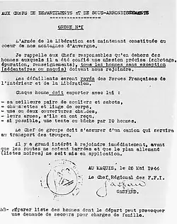 In spring 1944, Coulaudon became head of the Forces françaises de l'intérieur in the Clermont region, comprising four départements: Puy-de-Dôme, Haute-Loire, Cantal and Allier. As a member of the Regional Liberation Committee, he took part on 2 May in the General Meeting of the Auverge Resistance, chaired by Henry Ingrand at Boitout farm, a few kilometres from Paulhaguet.[12][13] He proposed three hideouts: one at Mont Mouchet, one in the Truyère valley and one at Le Lioran. The proposal was approved and it was decided to create two divisions, one political and one military.[12] Coulaudon was put in charge of the military division, and he set up headquarters at the forest rangers' house at Mont Mouchet, after sending out an order for mobilisation on 20 May. Quickly, in the Auvergne mountains, 10,000 men were assembled under Coulaudon's command at the three hideouts.[14]