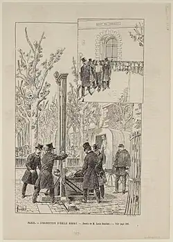 Around 3:15 AM, executioner Louis Deibler and his assistant set up the guillotine.[22] Deibler had met with Henry the previous day to discuss the details of the execution, and their conversation had reportedly gone smoothly.[22] At approximately 4:00 AM, the gate of the adjacent prison opened, and Henry stepped out onto the square. His wrists and ankles were bound, making his walk difficult. He advanced toward the scaffold with a resolute stride but paled as he neared the end of his path. He stopped and declared:[22]