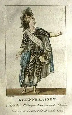 Étienne Lainez (or Lainé, Laînez) (23 May 1753 – 15 September 1822) was a French operatic tenor, and leading figure at the Paris Opera for over thirty years. In the course of his career there he created many tenor roles including Rodrigue in Sacchini's Chimène, Énée in Piccinni's Didon, Narcisse in Gluck's Echo et Narcisse, and Licinius in Spontini's La vestale.