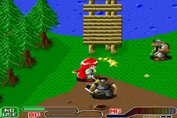 Controlling the characters is done with a directional pad, which moves the player character in eight directions, as well as both an attack and a jump button. Charging a powerful magic spell attack is done by holding the attack button down that depletes MPs. Pressing either both action buttons or the shift key on a keyboard allows access to the inventory screen to choose a character or item. Once a stage is completed, players can save or load their current progress as well as return to the title screen before entering any stage. If the HP meter is completely depleted by enemy attacks, the game is over. Prior to starting a playthrough, players have access to the options menu at the title screen of the game, where various settings can be adjusted.