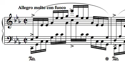 Étude Op. 25, No. 12 in C minor is one of Frédéric Chopin's formal studies for the piano, opus 25, dedicated À Madame la Comtesse d'Agoult. It was first published in 1837 in French, German, and English. In the first French edition, the time signature is 4/4, but most recent editions of this piece follow the manuscript and German editions, which indicate cut time.[1] This work is a series of rising and falling arpeggios in various chord progressions from C minor. It is sometimes nicknamed the "Ocean" étude.[2][3]