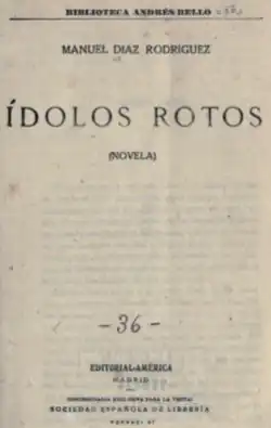 Ídolos rotos (Broken Idols) is a novel by the Venezuelan writer Manuel Díaz Rodríguez that was published in 1901. It is considered one of the most pessimistic novels written in Venezuela. It presents the social, political, and cultural life of people in Caracas with a defeatist attitude, where all hope of salvation has been abandoned. The central theme of the novel is the character Alberto Soria's failure in his effort to assert his ideals as an artist in Venezuela against a backdrop of the country's total decadence.