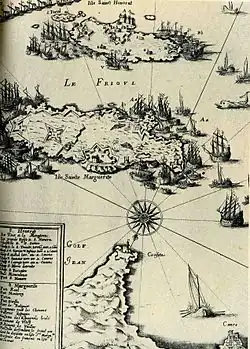 Map of 1639 representing the recapture of the Lérins Islands in 1637 by the French from the Spanish.