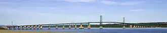 The bridge, which uses under-deck trusses on the approaches to the main suspension-type span, is the farthest downstream of the Saint Lawrence River's fixed crossings, but it does not cross the entire river.