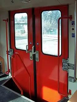The boarding compartments are very large with a width of up to 2600 mm to allow passengers to change quickly. The entrance doors are double-leaf swing and sliding doors and are air-operated. They have a clear width of 1400 mm. The doors are opened and closed centrally from the driver's cabs. Only after release can they be opened by passengers by briefly pulling the snap handle. There are two steps in the door area. Originally, the vehicles had side-selective door control without automatic door closing; the doors were closed by the driver after dispatch (similar to the Vienna subway). In order to prevent the passenger compartment from cooling down during the longer turnaround stops, a button was attached to each door with which the door could be closed.