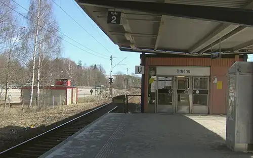 Östertälje is a station on Stockholm's commuter rail network, located in the district of Östertälje in south-eastern Södertälje, 34.3 km from Stockholm City Station.[1] The station consists of a single island platform with a ticket hall on the platform, accessible via a pedestrian tunnel.[2] As of 2015, it had an average of 3,000 boardings per winter weekday.[3] Travel time to Stockholm City Station is 34 minutes, and to Södertälje Centrum, 9 minutes.