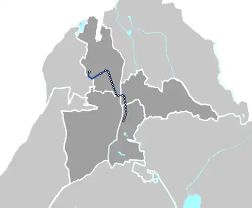 Line 1 runs from Ürümqi Tianshan International Airport through downtown Ürümqi and ends at Santunbei station. It has a total length of 27.615 km[5] and 21 stations.[5][6] It is fully underground.[7]
