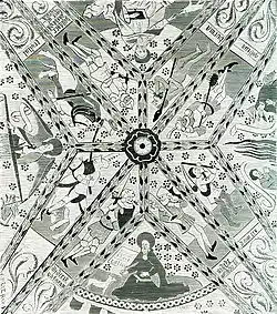 Fresco by Albertus Pictor of eight mostly biblical heroes, but including Dietrich von Bern fighting against Witege from the Old Swedish version of the Þiðreks saga, found on the vault of Floda church in Södermanland, Sweden, painted around 1479.[1] Dietrich is breathing fire and is found in the lower part of the image.