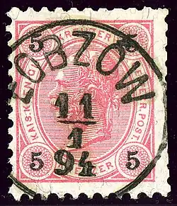 Austria KK 5 kreuzer stamp, cancelled at Łobzów in 1894