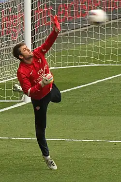 In Fabiański's early Arsenal career, two of his most notable appearances came in the 5–1 defeat to rivals Tottenham Hotspur in the 2007–08 League Cup semi-final and the first leg of the 2009–10 UEFA Champions League second round match with Porto. Fabiański received criticism for conceding soft goals in the Porto match as he scored an own goal and was blamed for the second goal after picking up a backpass from Sol Campbell, with Porto scoring from the resulting free-kick.[15][16] In January 2010, Arsène Wenger stated that Łukasz Fabiański could become one of the best goalkeepers in the Premier League.[17]