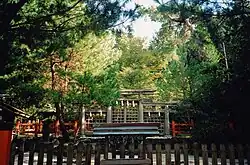 Hibara Shrine is a subshrine of Omiwa Shrine at the foot of Mount Miwa in Sakurai, Nara Prefecture. The shrine is identified as the place where the Yata-no-Kagami and the Kusanagi-no-Tsurugi were first enshrined after they were removed from the imperial palace. It is the first of many Moto-Ise shrines.[12][13][14] Amaterasu was originally enshrined there before eventually moving to other Moto-Ise shrines and then finally to Ise Jingu.[14] It has an Iwakura rock and a Shinza made of Sakaki wood.[14]