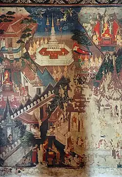 Buddhist texts all state that Śāriputra died shortly before the Buddha, with texts generally indicating he died in his hometown.[65][72] According to Pāli commentaries, Śāriputra arose from meditation one day and realized through his meditative insight that the chief disciples were supposed to achieve parinirvana before the Buddha, and that he had seven more days to live.[65][73] Śāriputra then traveled to his hometown to teach his mother, who was yet to be converted to Buddhism. After he converted his mother, Śāriputra died peacefully on the full moon day of Kartika a few months before the Buddha.[65] According to Mūlasarvāstivāda texts, however, it is said that Śāriputra achieved paranirvana voluntarily because he didn't want to witness the Buddha's death, in some accounts he was also motivated by Maudgalyāyana intending to achieve paranirvana after being beaten and mortally injured by a rival religious group.[65][74] In the Sarvāstivāda account, Śāriputra and Maudgalyāyana both achieved paranirvana voluntarily on the same day, because they didn't want to witness the Buddha's death.[75] In several versions of the story, various heavenly beings from Buddhist cosmology are said to have come to pay respect to Śāriputra near his time of death.[76][77]