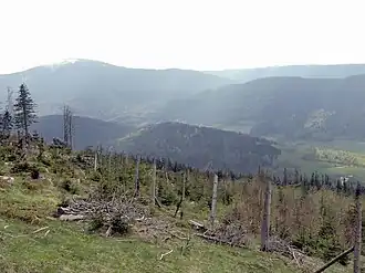 The Landscape Park takes its name from the highest peak in the range, Śnieżnik (1,424 m),[2] which forms a triangle with (similarly sounding) Śnieżka, as well as Ślęża peaks, further apart, connected by a red hiking trail only for qualified tourists.[3]
