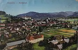 Škofja Loka lies at an elevation of 354 meters (1,161 ft)[4] at the confluence of the Poljane Sora and the Selca Sora rivers, at the transition of the Sora Plain into the Škofja Loka Hills and the Polhov Gradec Hills. Its old center stands on river terraces, and comprises Town Square (Plac) and Lower Square (Lontrg). On a plateau above the town stands Loka Castle, which houses the Loka Museum.[5] Above the castle rises Krancelj Hill (475 meters or 1,558 feet). North of the town center is Kamnitnik Hill (414 meters or 1,358 feet high), known for its conglomerate rock.[6] Immediately south of the town is a plain known as Viršk or Viršk Plain (Slovene: Virško polje), which the Poljane Sora flows through before joining the Selca Sora. The name Viršk is a corruption of German Hirsacker 'millet field', named for the millet that was grown there in the past.[7]