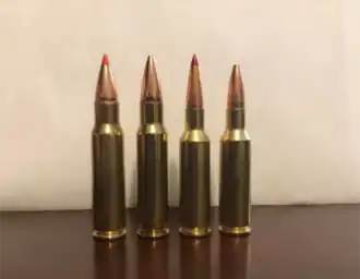 ![]() From left: 6.8 SPC (110gr VMax), 6.8 SPC (90gr JHP), .224 Valkyrie (88gr ELD), .224 Valkyrie (75gr FMJ) | ||||||||||||||||