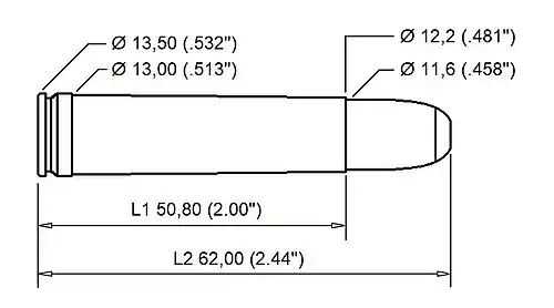 The .458×2-inch American is a belted, straight, .458 caliber (11.6 mm) big-bore cartridge designed by Frank Barnes. It is based on the .458 Winchester Magnum shortened to 2 in (51 mm).[1]