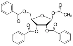 1-O-Acetyl-2,3,5-tri-O-benzoyl-β-D-ribofuranose, also called β-D-ribofuranose 1-acetate 2,3,5-tribenzoate, is a ribose-derived compound used in nucleoside synthesis.[1]