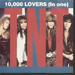 "10,000 Lovers (In One)" is a hit single by the Norwegian band TNT, taken from their 1987 album, Tell No Tales. It was written about a girl who TNT's vocalist at that time, Tony Harnell, knew. The single reached the Billboard Hot 100 chart in America, peaking at number 100 and earned the band a Spellemannprisen.