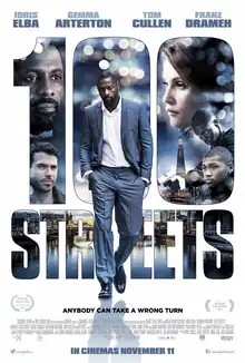 100 Streets is a British drama film directed by Jim O'Hanlon and starring Idris Elba. It made its debut in the United Kingdom on 11 November 2016, before being released in American cinemas and on video-on-demand on 13 January 2017 by Samuel Goldwyn Films.[3]