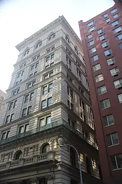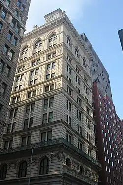The company decided in August 1893 to hire Hatch, who was less well-known than the other competitors, to design the annex.[98] Plans for the annex were filed in April 1894.[99][100] The project would also involve masonry contractor L. W. Armstrong, marble contractor Norcross Company, iron contractor Post and McCord, and carpenter E. Hilbrand.[100] Construction commenced in May 1894, but Hatch died three months later, before construction was completed.[27][98] After Hatch's death, McKim, Mead & White took over the project,[90][2] designing an annex that extended about 200 ft (61 m) west from Elm Street.[101] The annex ultimately cost $1.5 million to construct.[16] The Merchant's Club moved into the top two stories of the annex, which opened in February 1896.[68] The New-York Tribune wrote that the structure would be "one of the most striking improvements in Broadway" south of Canal Street.[101] The New York Times described the New York Life Building as being in a "rivalry" with the Central National Bank Building to the south, at Pearl Street and Broadway.[29]