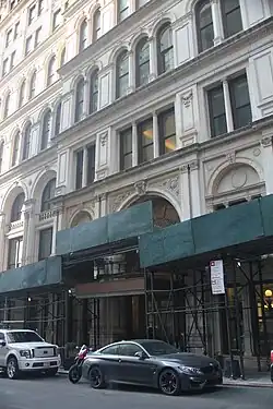 The western end of 108 Leonard comprises a pavilion measuring three bays wide on Broadway, Catherine Lane, and Leonard Street.[18][27] All three elevations of this pavilion are clad with rusticated blocks of marble.[18] The main entrance on Broadway is designed to resemble a portico, with double-height pilasters and freestanding columns topped by an entablature with a balustrade.[23] The portico originally contained six freestanding columns that projected from the facade,[22][28] but these were removed in 1912 at the request of the government of New York City.[22] Each of the polished-granite pillars weighed over 16 short tons (14 long tons; 15 t) and measured 23 ft (7.0 m) long by 3 ft (0.91 m) across.[29] The capitals of each column are decorated with rosettes and swags in a modified Ionic order.[22] Recessed within this main entrance is a double-height curved vestibule, which includes two archways with acanthus and scallop decorations.[23][30] The archways themselves contain cast-bronze window frames above the doors, while the vestibule's ceiling contains a coffered ceiling with an eagle motif at the center.[30] On either side of the entrance are panels with acanthus motifs.[22]