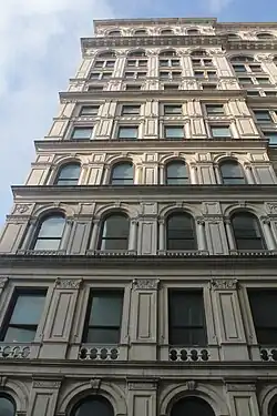 The 85 ft-high (26 m) building,[92] with four stories and a raised basement, occupied the western half of the block.[92][93] The site was irregularly shaped, with a frontage of about 200 ft (61 m) on Leonard Street and Catherine Lane.[92][94] Its marble facade included Ionic columns in a manner resembling the Erechtheion in Athens, as well as heavy plate-glass windows.[92][95] The basement had brick-and-stone walls;[92] the site sloped downward to the east, where the basement contained storefronts.[9] The central portion of the building was three stories high (excluding the basement) and was flanked by four-story pavilions at either end.[9][92] The main entrance on Broadway was through a portico, topped by a pediment with an eagle. Running west-east across the first floor was a 12 ft-wide (3.7 m) hallway, which was flanked by two large rooms and connected to a stair with an elevator shaft.[9] The old New York Life Building was one of the first buildings in New York City with an elevator.[96] After the building opened, Henry Fernbach designed a mansard roof, which was completed in 1879.[91][3]