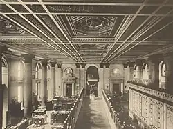 The former New York Life banking room, known as the general office, is on the east side of the building, occupying the first and second stories (floors 2 and 3[c]) next to the lobby.[54][56] The double-height space measures three bays from north to south and six bays from east to west. The general office contains double-height windows facing north and south, as well as freestanding Corinthian-style columns that are arranged into two groups.[56] Tellers' cages, with screens at their tops, were arranged around the room.[62] The ceiling is painted and contains gilded octagonal coffers, which in turn are separated by a grid of molded bands. The south wall contains a marble safe,[56] which was originally freestanding.[62] The west and east walls each contain three arches. The central arches on either side lead to the hallways on floor 3, and the two outer archways on the eastern wall contains bulls-eye windows. The balcony at floor 3 was part of Hatch's original plan but was removed from McKim, Mead & White's final design; it was added in a later renovation.[56] In the 2010s, the banking room was converted into a banquet hall.[27][57] An elevator connects both levels of the banking hall.[63]