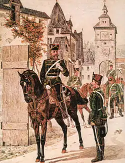 The 10th (Magdeburg) Hussars Regiment (German: Magdeburgisches Husaren-Regiment Nr. 10) were a Prussian Light cavalry regiment of the IV Corps that was formed in late 1813 during the War of the Sixth Coalition against Napoleon after the Battle of Leipzig. The Hussars were a distinctively dressed light cavalry of East European origin.[1] The 10th Hussars were stationed from 1814 to 1884 in Aschersleben and after 1884 in Stendal. They fought in 1866 at the Battle of Königgrätz and later in World War I.
