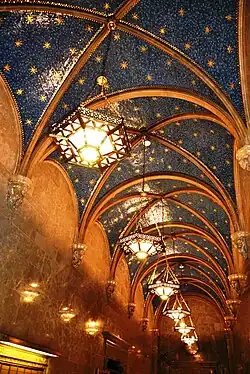 The ceiling above the banking room contains six deep beams, which are actually steel trusses.[11][30] These beams are supported by imitation-stone corbels on the walls, which conceal steel brackets beneath. The ceiling is coated with six layers of materials, giving the impression that it contains coffers and small wooden beams.[30] Six cast-bronze chandeliers are anchored from the ceiling, each of which has three tiers.[29][30] The central lamp was modeled after that of the Hagia Sophia.[11] Originally, the center of the ceiling had a skylight with twelve panels of pale amber glass.[10] The skylight measures 35 by 60 feet (11 by 18 m).[19]