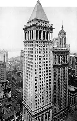 The annex occupies the remainder of the plot and is L-shaped in plan.[15] Prior to the construction of the annex, the land below it was occupied by three buildings.[16] The seven-story Astor Building was located at 10–12 Wall Street, directly to the west of the original tower.[17][18] The Hanover National Building at 5–11 Nassau Street, erected in 1903,[19] was a 21-story building north of the original Bankers Trust Building, which extended to Pine Street.[16] The final building on the lot was 7 Pine Street, a 10-story building to the northwest of the original tower.[20]