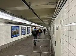 Between February 27, 2023, and December 11, 2023, the transfer passageway between Sixth and Seventh Avenues was closed for the installation of elevators and reconfiguring of the ramp as a part to make the station compliant with the ADA.[83] A free out-of-system transfer was available while the passageway was closed. The work involves constructing nine elevators: two from the IRT platforms to the mezzanine; one from the mezzanine to street level at Seventh Avenue; two from the lower mezzanine levels to the BMT platform; two from each IND platform to upper mezzanine; and two more from both the BMT and IND mezzanine levels to street level at Sixth Avenue.[83][84]