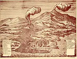 The eruption is also known as the Great eruption[96] and the year of great ruin by contemporaries.[53] News of the eruption spread to England, France, Portugal, Ireland, and Scotland, where government news pamphlets about the eruption were published. The news reached as far as Cambridge, Massachusetts, in North America.[97] The noted Canary Islands poet Juan Bautista Poggio y Monteverde may have drawn inspiration from the eruption.[98] The 1669 eruption has been portrayed in a number of contemporaneous iconographic works[53] and is the most commonly depicted eruption of Etna in its iconography.[99] After 1669, the number of large eruptions of Etna decreased and the interest in portraying the volcano and its eruptions waned as a consequence.[100]