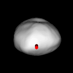 Animation of a Psyche shape model viewed from 20° south latitude. The red peg is at 0° longitude.