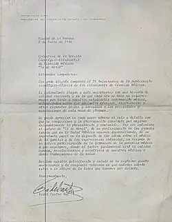 Letter of congratulation from Fidel Castro on the 25th anniversary of 16 de Abril